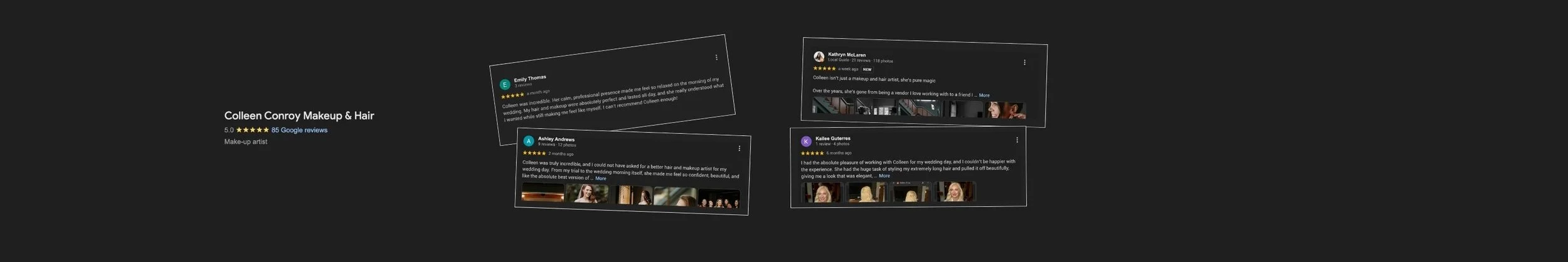 “I wish I could leave 500 stars and reviews for Colleen. You could not find a more wildly talented hair and makeup artist, or a more incredibly kindhearted human. She brought so much love, care, and attention to every detail of getting ready on my wedding morning — from the way she got to know my mom, to the jokes she made with my sister, to making sure every detail of my hair and makeup was exactly how I envisioned it and more. She truly thought of everything, making wonderful suggestions and providing invaluable support leading up to the wedding day.”